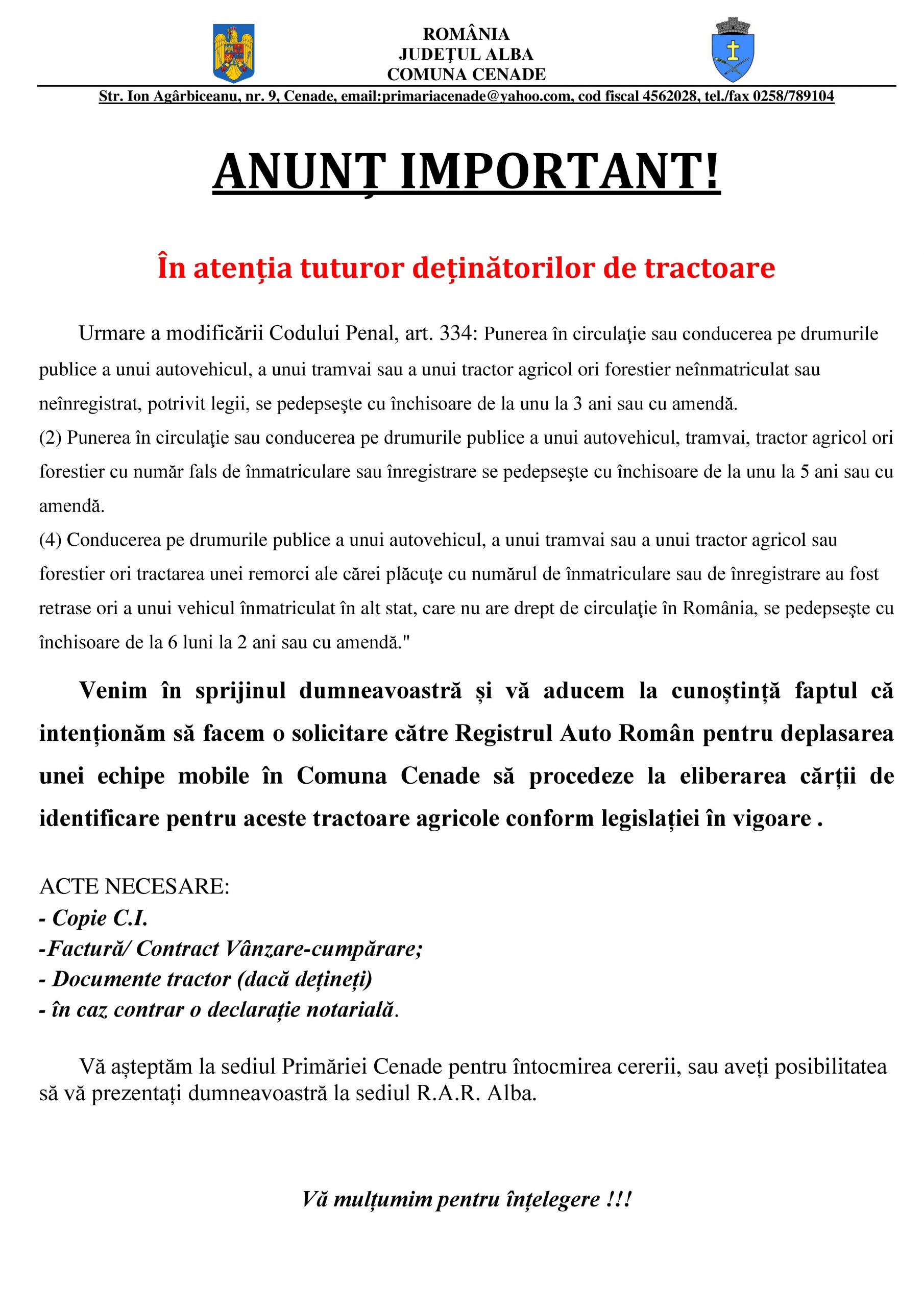 ANUNȚ IMPORTANT!-În atenția tuturor deținătorilor de tractoare
